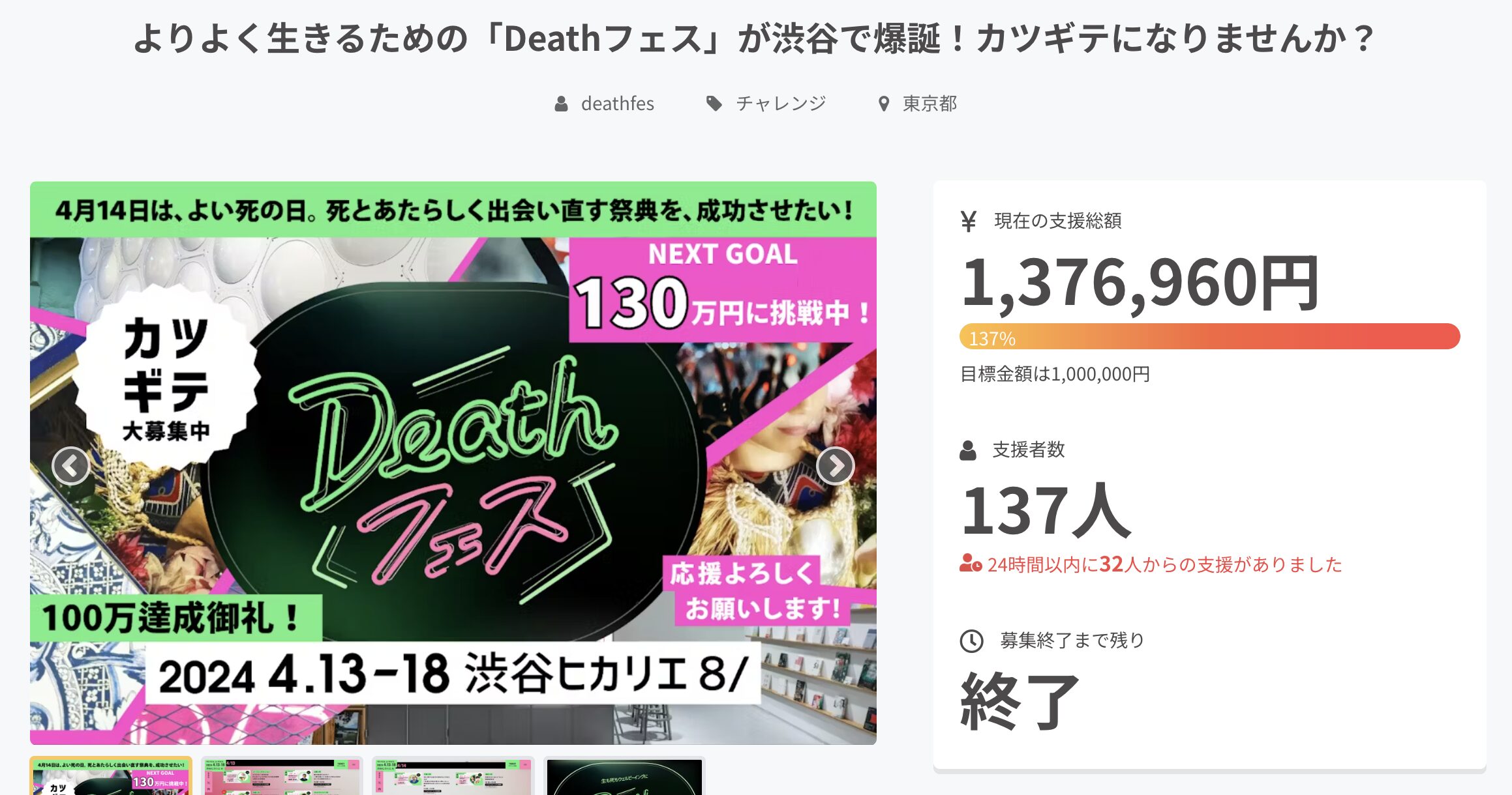 137人の方から、1,376,960円ものご支援をいただきました。本当にありがとうございました。