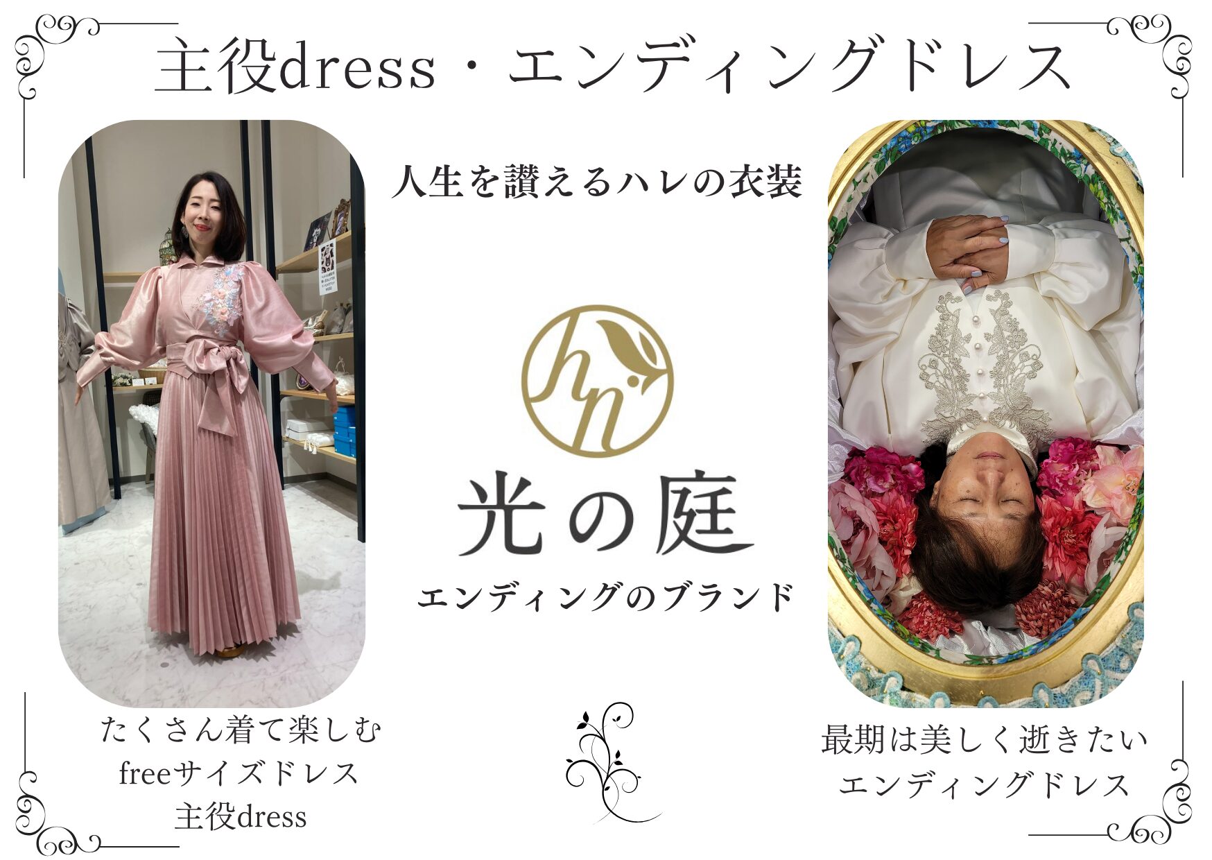今回は生きているうちにたくさん着て最期はエンディングドレスになる「主役dress」、還暦パーティや喜寿のお祝いに主役が着るドレスを作りました。生前葬や結婚式のママdressなど生きているうちに主役になる時のドレス。シニアもきれいに着られるデザイン、フリーサイズで5色展開です。そして、お棺に入るためだけに作られた最高に美しいエンディングドレスは、寝姿がきれいに見える型紙から作り上げたドレスです。どちらも試着してください。