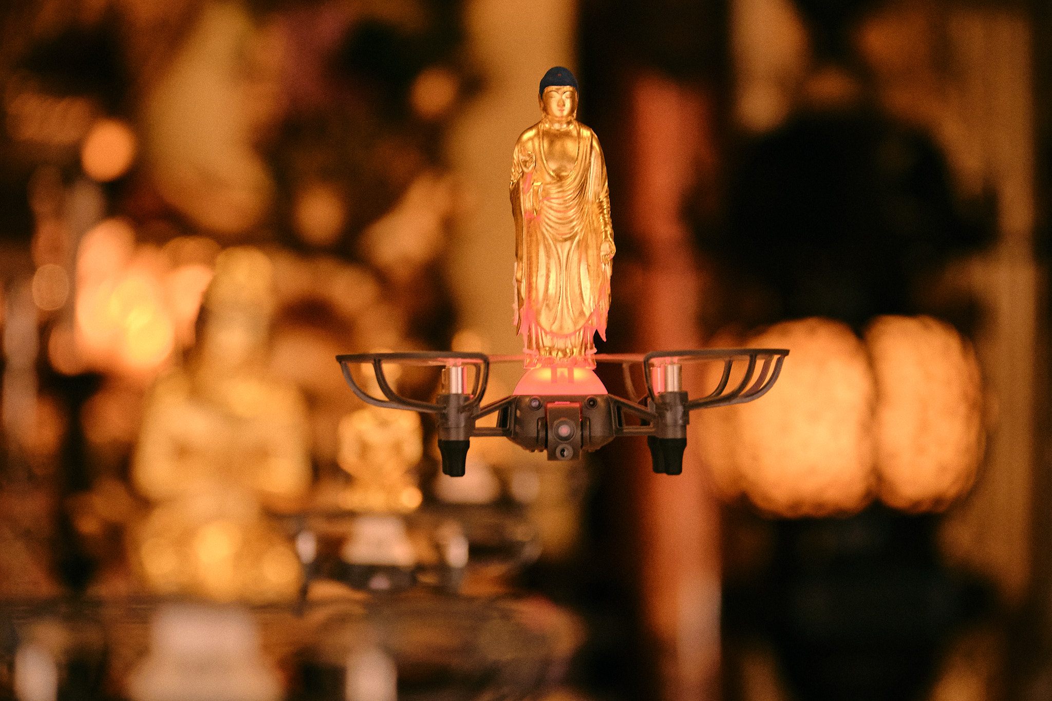「仏像はドローンに乗せれば宙を舞わせられる!」という仏師・三浦耀山の閃きから2018年に誕生したのが「ドローン仏」である。現代のテクノロジーを駆使した先鋭的な仏像表現であるが、根底にあるのは、平安時代や鎌倉時代に仏画のモチーフとして多用された「極楽来迎図」へのオマージュである。