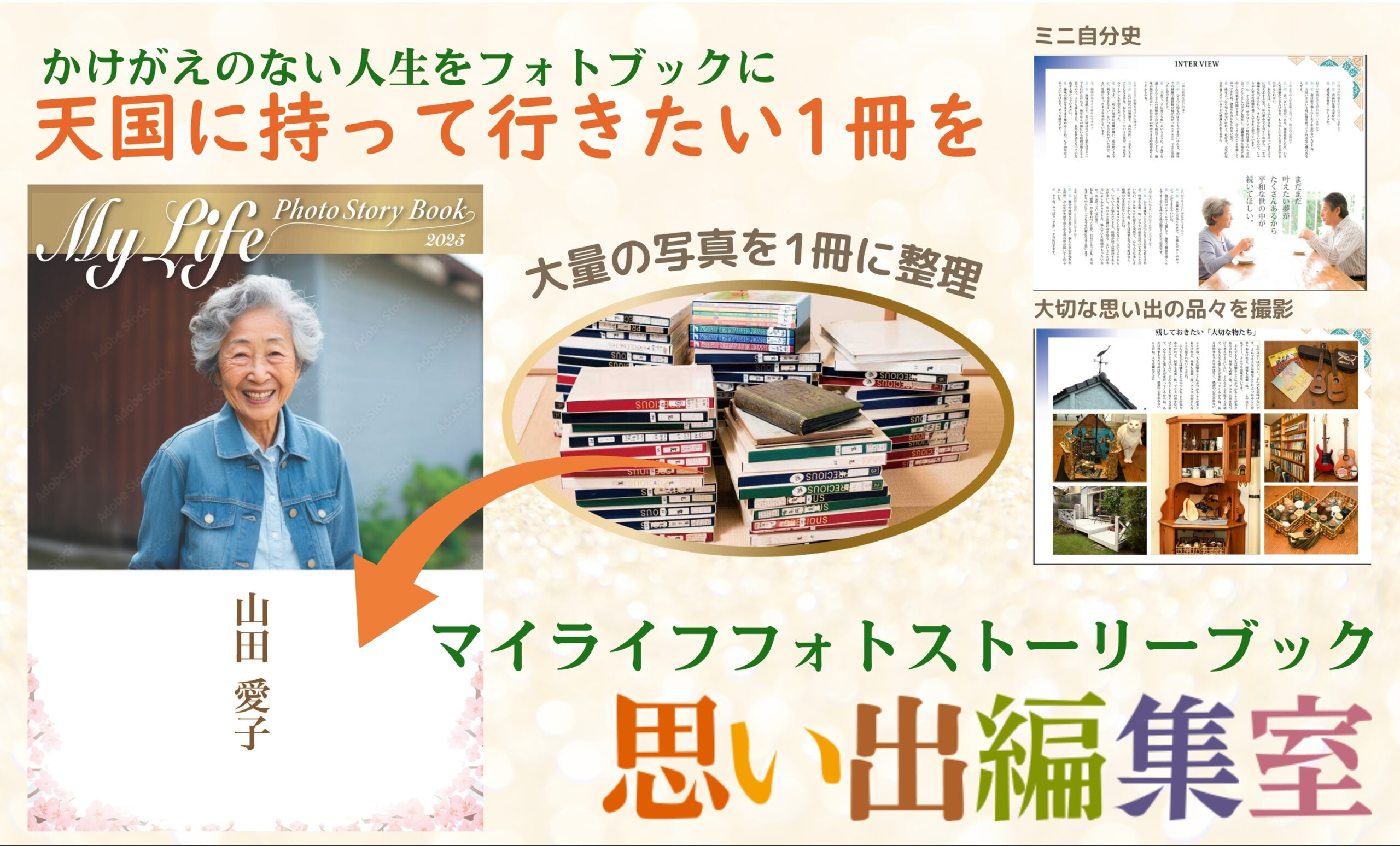 片づけても手放せない大切な思い出の写真や品々をフォトブックにまとめ、天国に持って行きたい1冊をおつくりします。「思い出編集室」主宰・小野めぐみオリジナル「終活片づけメソッド」、思い出はそのままに部屋も心もスッキリできる極意は精神科医推薦の『心の終活』。思い出の品々(物・写真)を整理し、何を残したいかを見極めることで、最期まで自分らしい生き方が見つかります。人生の集大成となる「思い出フォトブック」は晩年の心を穏やかに整え、未来へのバトンとなる存在です。